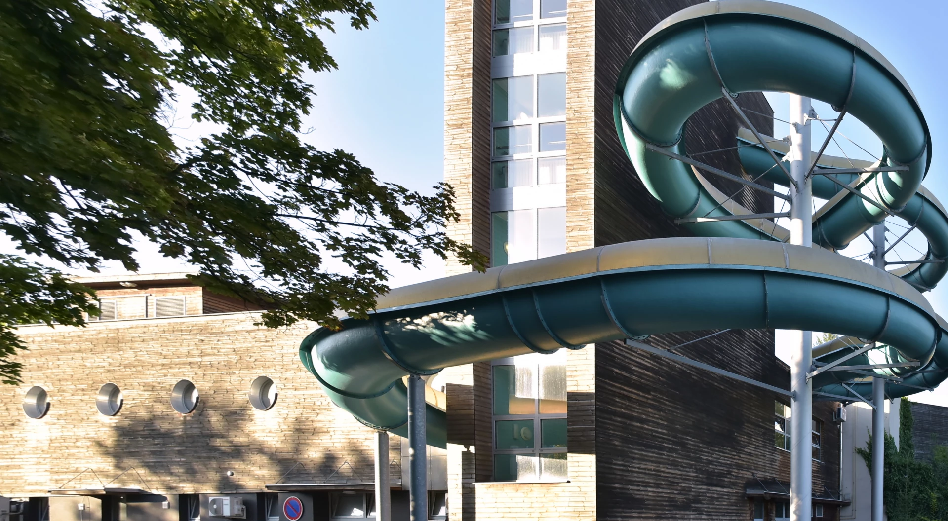 Stometrový krytý tobogán pro celoroční použití se zabudovanými zrychlovacími prvky, který je veden venkovní částí areálu.