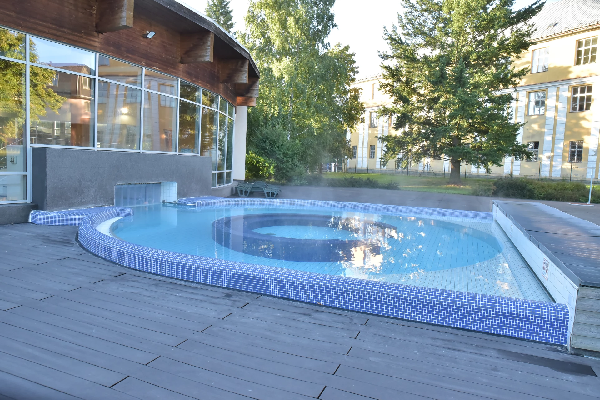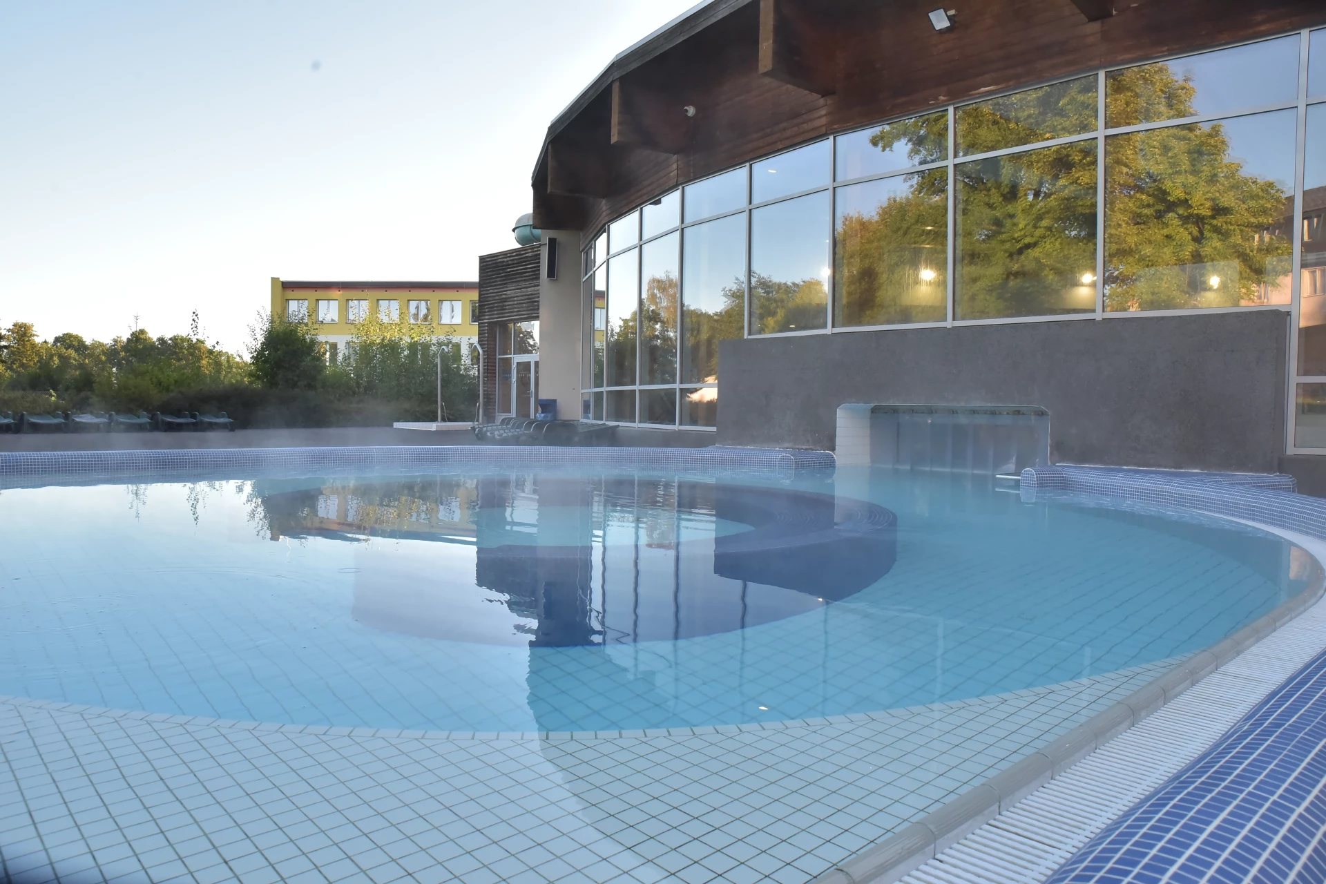 Do venkovní terasy umístěný samostatně tvarovaný kruhový bazén propojený s rekreačním bazénem. Podvodní trysky způsobují permanentní pohyb vody.